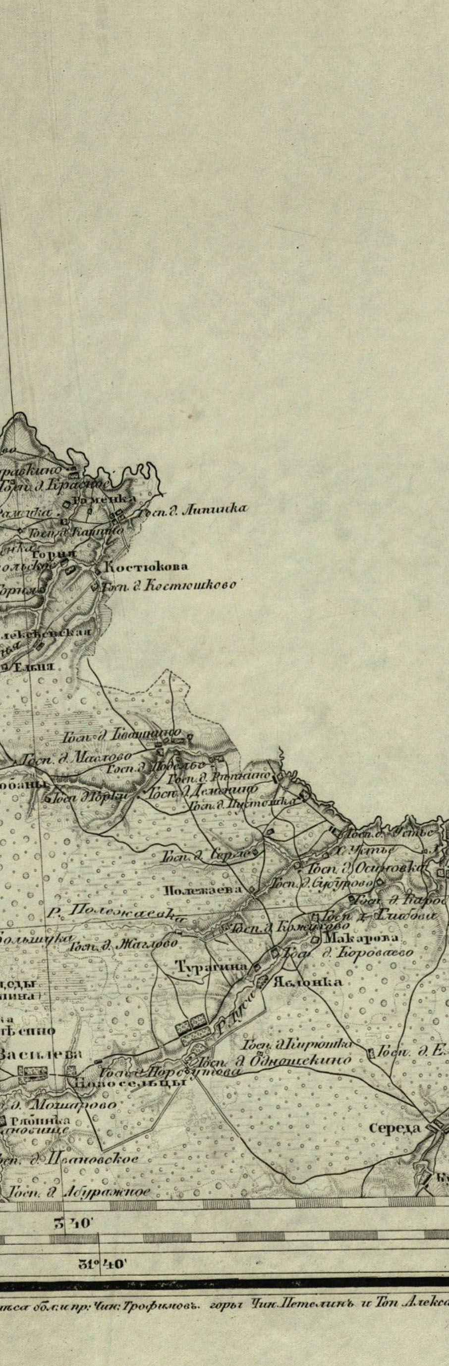 | Данный фрагмент топографической карты 19 века покрывает район Сычевского уезда Смоленской губернии.