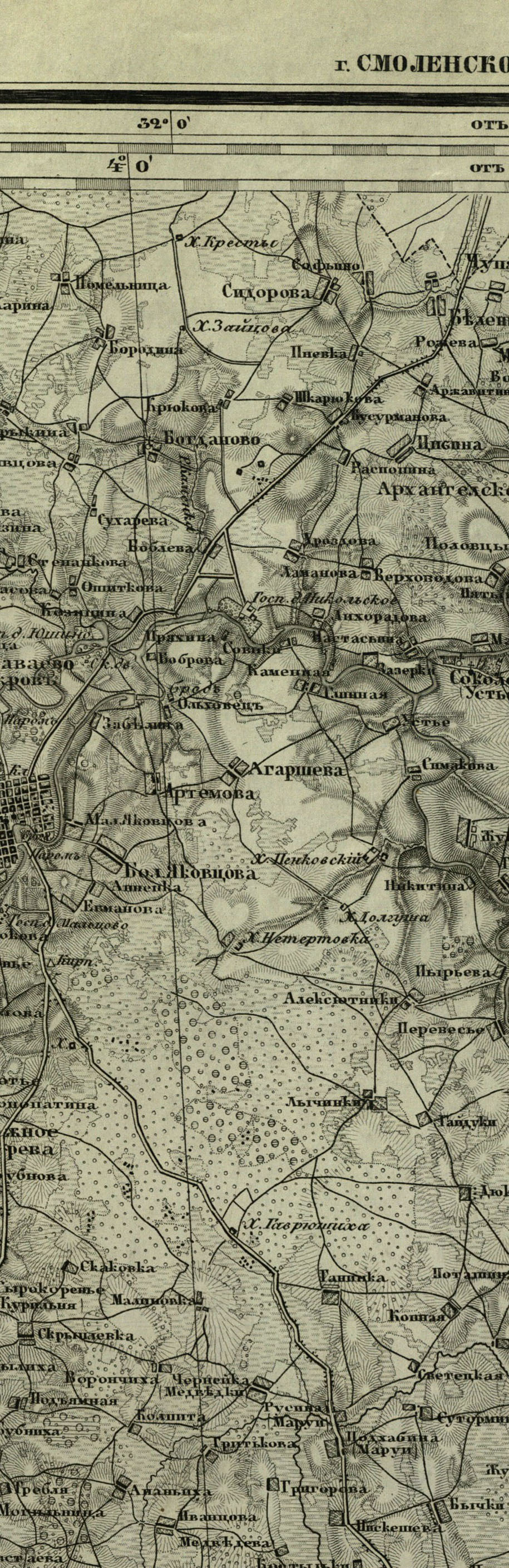 На старинной карте показаны деревня Чупятина, деревня Софьино, деревня Сидорова, деревня Помельница, деревня Бородина, деревня Пневка, деревня Рожева, деревня Беленинова, деревня Водопьянова, деревня Шкарюкова, деревня Аржавитина, деревня Бусурманова, деревня Цибина, деревня Распопина, село Архангельское, село Богданово, деревня Крюкова, деревня Харина, деревня Тарарыкина, деревня Сивцова, деревня Сухарева, деревня Боблева, деревня Корабанова, деревня Пызина, деревня Степанкова, деревня Дроздова, деревня Половцы, деревня Ламанова, деревня Верховодова, деревня Ошиткова, деревня Козицина, деревня Пряхина, деревня Лихорадова, деревня Настасьина, деревня Совики, деревня Каменная, деревня Глинная, деревня Зазерки, деревня Устье, деревня Ольховец, деревня Забелина, село Караваево (Покров), деревня Соколово (Устье), деревня Симакова, деревня Агаршева, деревня Артемова, деревня Малая Яковцова, деревня Большая Яковцова, деревня Никитина, деревня Евманова, деревня Пырьева, деревня Алексютники, деревня Перевесье, деревня Лычинки, деревня Гайдуки, деревня Дюкова, деревня Поташина, деревня Конная, деревня Ганинка, деревня Скаковка, деревня Сырокоренье (Курильня), деревня Малиновка, деревня Скрыплевка, деревня Ворончиха, деревня Чернейка (Медведки), деревня Русина (Маруи), деревня Светецкая, деревня Подхабина (Маруи), деревня Григорова, деревня Гритькова, деревня Пискешева, деревня Бычки, деревня Иванцова, деревня Медведева, деревня Могильница, деревня Гребля, деревня Бубниха, деревня Подъямная, деревня Ананьиха, деревня Жукова, деревня Сутормина, деревня Бобылиха. На карте изображена река Каменка. В настоящее время территория, обозначенная на дореволюционной карте, находится в Сычевском районе Смоленской области. |