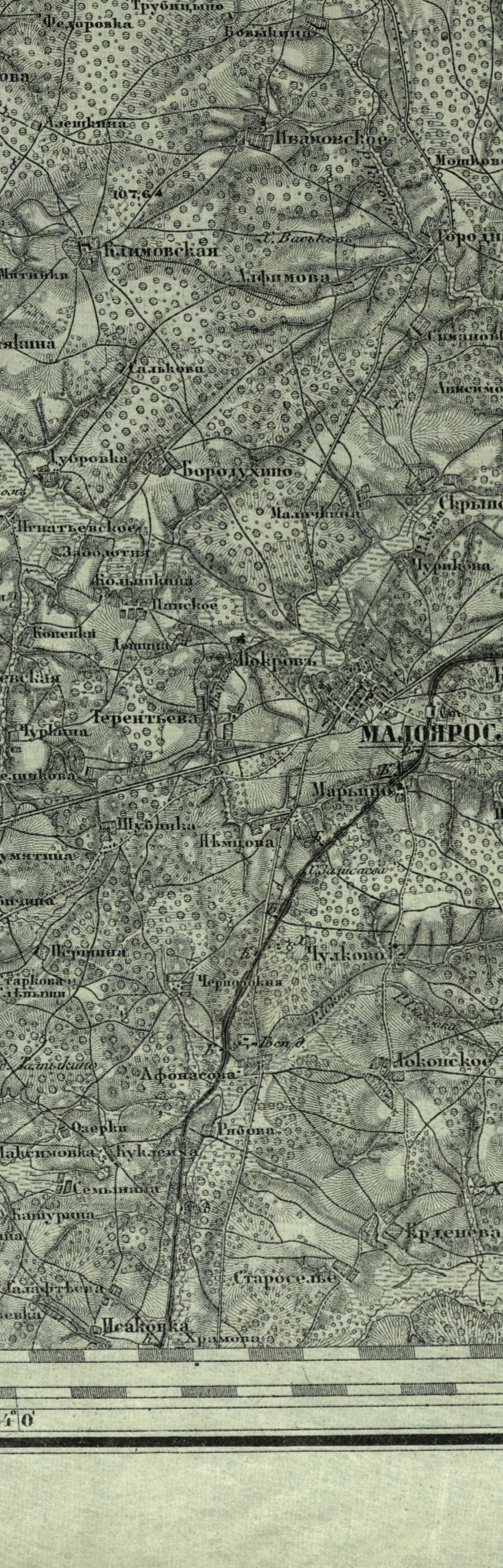 | Представленный участок топографической карты 19 века отображает территорию вблизи Калужского шоссе. На карте отмечены села и деревни: Трубицыно, Федоровка, Бовыкино (Бавыкино), Ивановское, Алешкина, Мошково, Климовская, Алфимова, Салькова, Дубровка, Бородухино, Игнатьевское, Малачкина, Заболотня, Покров, Терентьева, Чуркина, Шубинка, Немцова, Марьино, Першина, Афонасова, Локонское, Озерки, Рябова, Максимовка, Куклеиха, Семынина, Кашурина, Халафтеева, Староселье, Ерденева, Семынина, Исаковка, Храмова, Староселье, Старкова (Слепыши), Трубичина, Городня, Анисимовка, Скрыпорова (в н.в. Скрипорово), а также уездный город Малоярославец. В указанная местность находилась в Боровском и Малоярославецком уездах Калужской губернии, а в настоящее время находится в одноименных районах Калужской области. На карте изображены реки Лужа, Городня, Глазовка, Локня. |