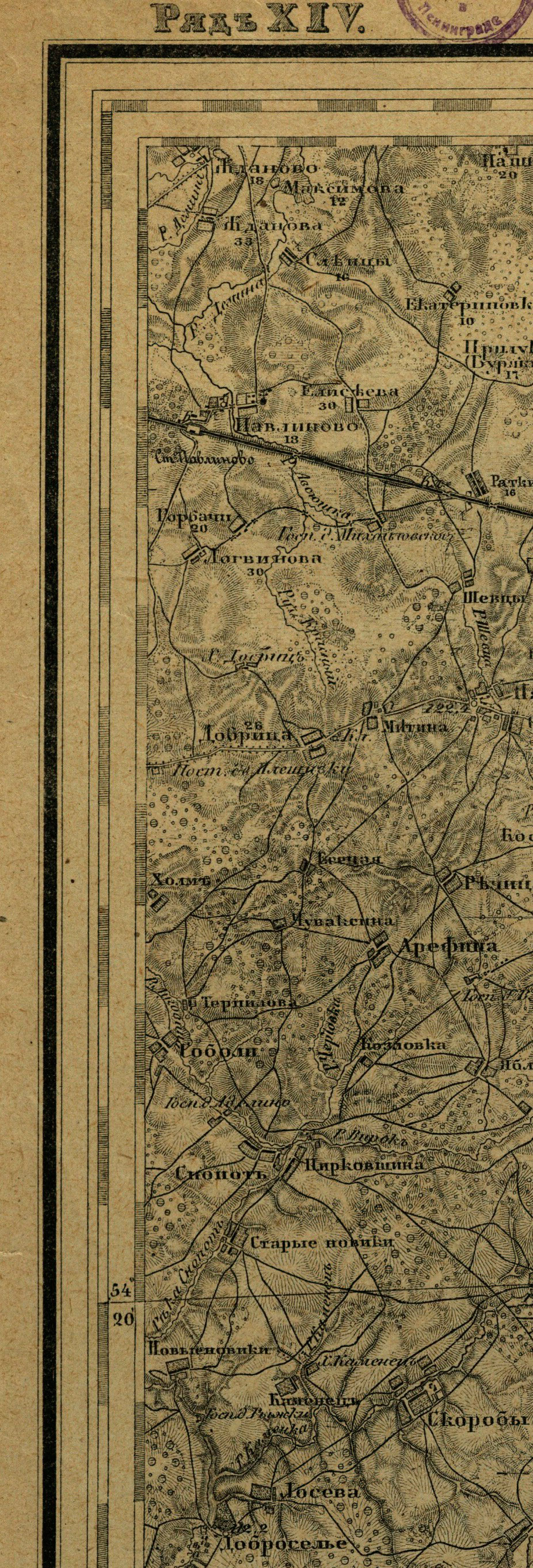 Представленная на фрагмент топографической карты 19 века территория входила в состав Ельнинского уезда Смоленской губернии и Мосальского уезда Калужской губернии. На дореволюционной карте обозначены деревня Жданово, деревня Максимова, деревня Пашни, деревня Жданова, деревня Слейцы, деревня Екатериновка, деревня Елисеева, деревня Прилуки, деревня Буряки, деревня Павлиново, деревня Горбачи, деревня Логвинова, деревня Шевцы, деревня Добрица, деревня Митина, деревня Пятницко, деревня Холм, деревня Есечая, деревня Речница, деревня Чуваксина, деревня Арефина, деревня Терпилова, деревня Козловка, деревня Гоболи, деревня Яблонова, деревня Цирковщина, деревня Снопоть, деревня Старые новики, деревня Новые новики, деревня Каменец, деревня Скоробы, деревня Лосева, деревня Доброселье. На старой карте показаны реки Каменка, Каменец, Снопоть, Вырок, Луговицы, Черевка, Шевца, Авсюшка, Демина. Данная территория современного Спас-Деминского района Калужской области. |