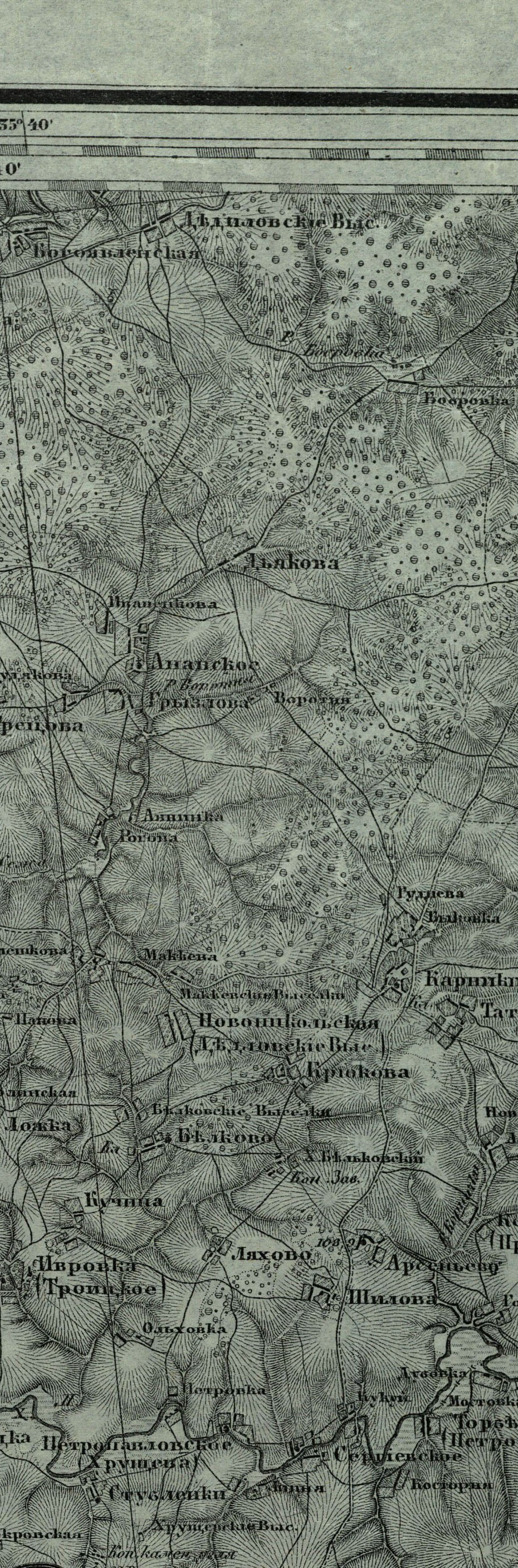 На карте показаны села и деревни Дедиловские Выселки, Богоявленская, Бобровка, Дьякова, Ананское, Грызлова, Воротня, Грецова, Аннинка, Рогова, Руднева, Быковка, Макеевские выселки, Белковские выселки, Белково, Арсеньево, Сергиевское, Крюкова, Ложка, Ляхово, Ольховка, Карники, Новоникольская (Дедловские Выселки), Крюкова, Кучина, Ивровка (Троицкое), Шилова, Петропавловское (Хрущева), Стубленки, Хрущевские Выселки, Косторня, Истровка, Покровская, Мостовка, Торбеевка (Петровская) и другие, более мелкие селения. Так же на карте