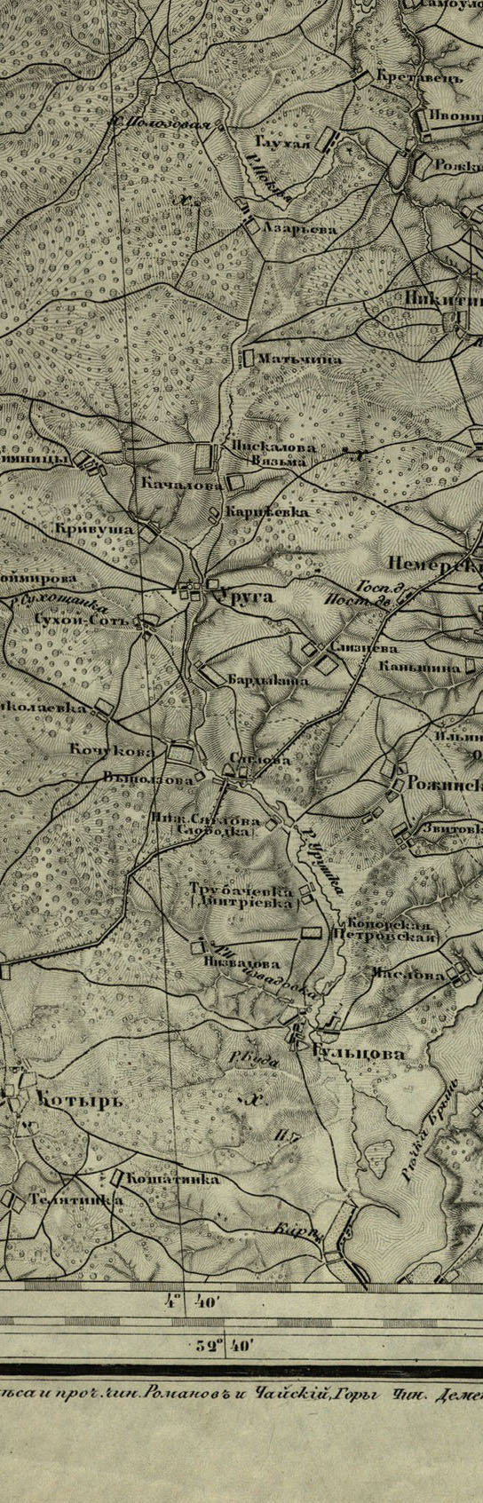 На карте 19 века обозначены села и деревни: Кретавец, Глухая, Азарьева, Рожки, Никитино, Матьчина, Зимницы, Кривушка, Качалова, Нискалова (Вязьма), Кариеевка, Уруга, Сухой-Сот, Бардыкина, Николаевка, Слизнева, Каньшина, Кочукова, Выползова, Слелова, Ивонина, Немерзки, Рожинск, Звитовка, Ниж. Сяглова, Трубачеевка (Дмитриевка), Низвадова, Копорская (Петровская), Маслова, Гульцова, Котырь, Телятникова, Кошатинка. На карты обозначены реки Сухощанка, Урушка, Буда, Брынь. Указанная территория ранее находилась в Мещовском и Жиздринском уездах Калужской губернии. В настоящее время на данной местности находится Сухиничский и Думиничский районы Калужской области. |
