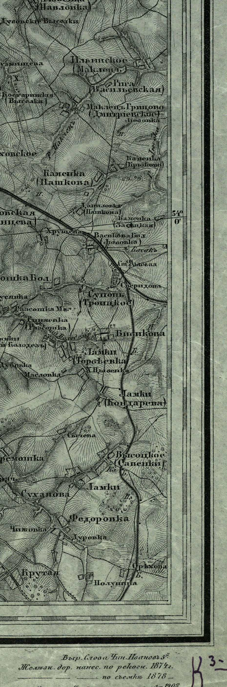 На карту нанесены села и деревни Дубровсе Выселки, Кузмищева, Ильинское (Маклец), Супонь (Троицкое), село Высоцкое (Савенки), Рига (Васильевская), Костаринская (Выселки), Кузьмищева, Маклец Грицово (Дмитриевское), Каменка (Пашкова), Даниловка (Пашкова), Васикова Большая (Любовка), Хрущева, Петровкая (Казанцева), Разсошка Большая, Бибикова, Ламки (Торбеевка),