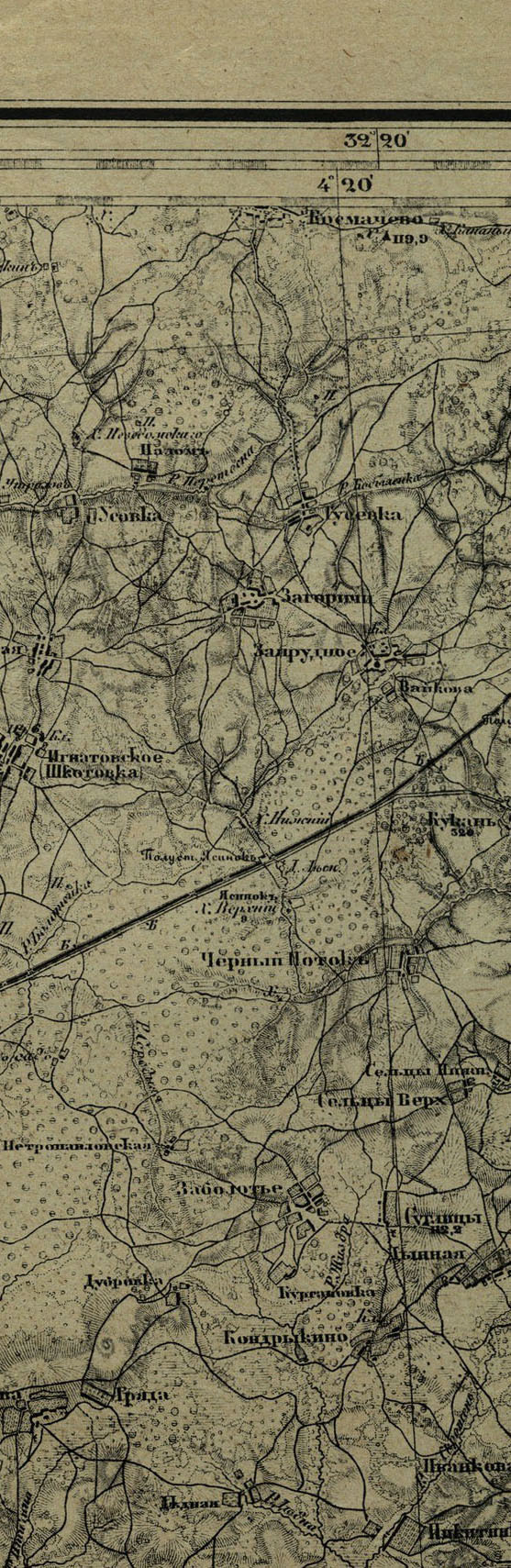 На данном участке карты 19 века изображены Людиновский и Жиздринский районы Калужской области. На карте отмечены деревни и села Космачево (в н.в. Космачово), Усовка, Гусевка, Загоричи, Запрудное, Игнатовское, Шкотовка, Черный Поток, Кукань, Сельцы нижние, Сельцы верхние, Дынная, Кондрыкино, Гряда, Никитина. Указанная территория была Жиздринским уездом Калужской губернии. На карте отмечены реки Жиздра, Болотейка, Перетесна.