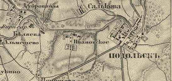 Топографическая карта Подольского уезда 1860 годаНа данной странице представлена первая топографическая карта Подольского уезда. Ее часто называют картой "Шуберта", так как работы проводились под руководством Федора Федоровича Шуберта. Карта очень детализирована, впервые на ней обозначены не только населенные пункты, но и сельские дороги, тропинки, прописаны все географические названия, вплоть до ручьев. Убедиться в этом вы можете, скачав ее черно-белую версию на странице уезда.