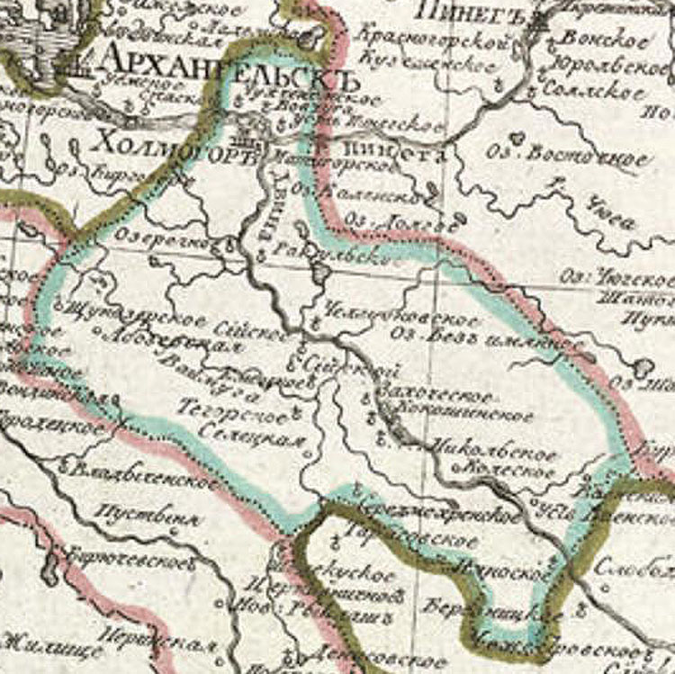 фрагмент карты Архангельской губернии из Атласа Российской Империи за 1800 год, масштаб не указан. Карта времен межевания. |