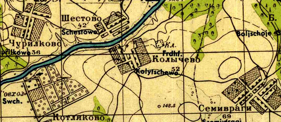 Фрагмент карты Никитского уезда на немецкой карте 1940 года, 1см=500м, Колычево - бывший Никитск