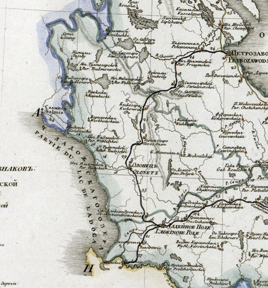 карта части Олонецкой губернии с Олонецким уездом 1821 года. Данные границы уезда сохранились до революции.