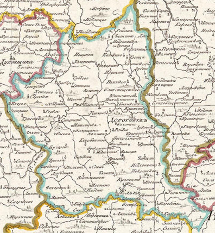 фрагмент карты Смоленской губернии из Российского атласа 1800 года, масштаб не указан. Карта времен межевания. |