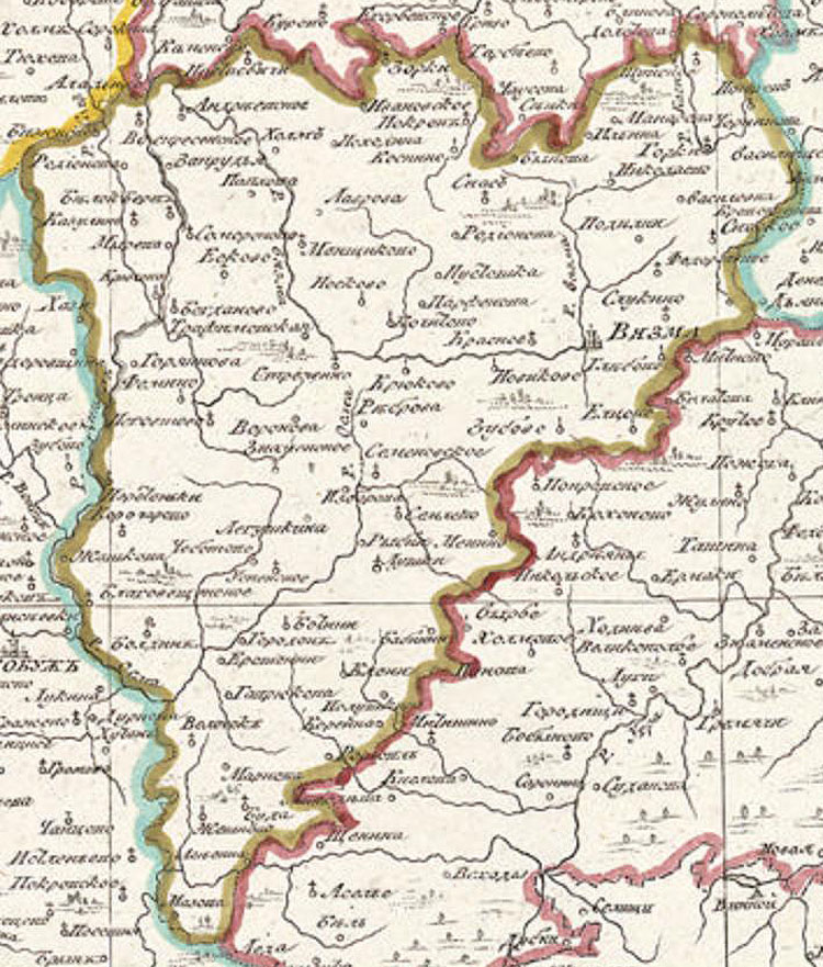 Нетопографическая карта Вяземcкого уезда 1800 годаНа момент создания атласа 1800 года, Вяземский уезд увеличил свои границы за счет присоединения на юге части территории Дорогобужского уезда. Эти изменения происходили в связи с реформами Павла Первого, по которым менялись многие внутренние границы Российской Империи. Центральным уездным городом является Вязьма.
