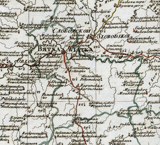 карта части Вятской губернии с Вятским уездом 1821 года. Данные границы уезда сохранились до революции.